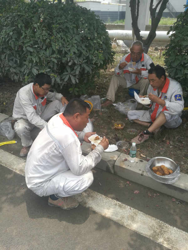 6月28日,在炎炎烈日之中,在地面溫度達40多度的中午時間,位于池月路富佳攪拌站的環網柜旁,滿頭大汗的于廣兵、孫忠清、孫正宏、周玉民等顧不上休息,正盤坐在樹蔭下對付著吃著快餐,與接下來的搶修工作爭搶時間。隨后這一畫面被筆者用手機捕捉下來。筆者相信,這不僅僅是一張堅守在一線的工人們高溫下吃飯的照片,更是一張當前乃至今后一個時期,臺北供電所員工們在“高質發展、后發先至”新形勢下“愛企奉獻,愛崗敬業”的真實寫照。