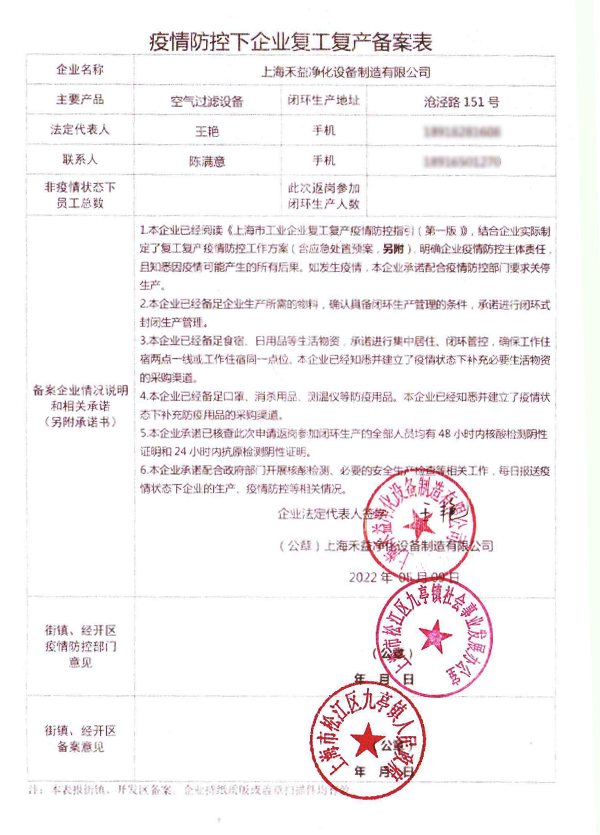 目前上海疫情防控形勢正在積極向好,各企業精準穩妥推進復工復產。上海禾益凈化設備制造有限公司為確保疫情防控、生產經營“兩手抓、兩不誤”,堅持在“防疫中復工、復工中防疫”,積極推動企業有序恢復生產生活秩序,不斷提升服務質量,守好企業健康防線,讓復工復產無后顧之憂。