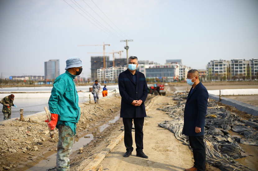 第一站來到海州灣公司昌圩班組。該班組4月1日礦鹵灌池,目前第四塊結(jié)晶池正在進(jìn)鹵,該公司三大組長帶著各自隊(duì)伍都來支援,一起給新灌結(jié)晶池更換新塑苫布,大家忙的不亦樂乎。王董事長首先慰問大家,新冠疫情暴發(fā)以來,海州灣公司廣大員工克服困難,一邊強(qiáng)化疫情防控,一邊加班加點(diǎn)抓生產(chǎn),雖然有的工作耽誤了,但是礦鹵灌池工作仍然趕在天時(shí)轉(zhuǎn)好之前進(jìn)行了。昨天進(jìn)鹵的結(jié)晶池底已經(jīng)鋪上了一層鹽,看起來甚是喜人。昌圩班組負(fù)責(zé)人,老先進(jìn)老黨員朱春年同志看到王董事長來檢查工作,他也非常高興,和海州灣公司負(fù)責(zé)人劉天義一同聚攏過來,與董事長攀談,匯報(bào)工作。最后王董事長強(qiáng)調(diào),一定要抓緊灌池,抓緊更換新塑苫布,打好“礦鹵復(fù)產(chǎn)”戰(zhàn),我們基礎(chǔ)產(chǎn)業(yè)牢固了,臺(tái)北的發(fā)展也就穩(wěn)固了。同時(shí),也不要忘記抓好疫情防控工作,職工集體工作時(shí)要保持一米線距離,保證不扎堆。劉天義、朱春年代表職工表態(tài),一定按照投資公司有關(guān)布置抓好各方面工作,一定拼命干,加油干,爭(zhēng)當(dāng)虎將打頭陣,當(dāng)好“臺(tái)北保衛(wèi)戰(zhàn)”主攻隊(duì)。